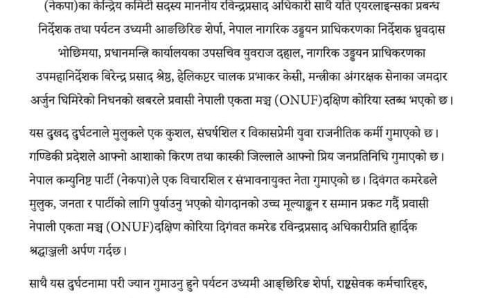 यहि फाल्गुन १५ गर्ने ताप्लेजुङ को फुङलिङ, १० सिस्नेभिरमा एअर डाइनेस्टीको हेलिकप्टर दुर्घटनामा परी निधन हुनुभएका नेकपाका केन्द्रिय सदस्य तथा पर्यटन मन्त्री रबिन्द्र अधिकारी सहित अन्य ६ जना विशिष्ट नागरिक हरुको निधन प्रती नेकपा को प्रबास संगठन प्रबासी नेपाली एकता मन्च (ONUF) द.कोरिया ले गहिरो शोक बक्तब्य जारी गरेको छ ।