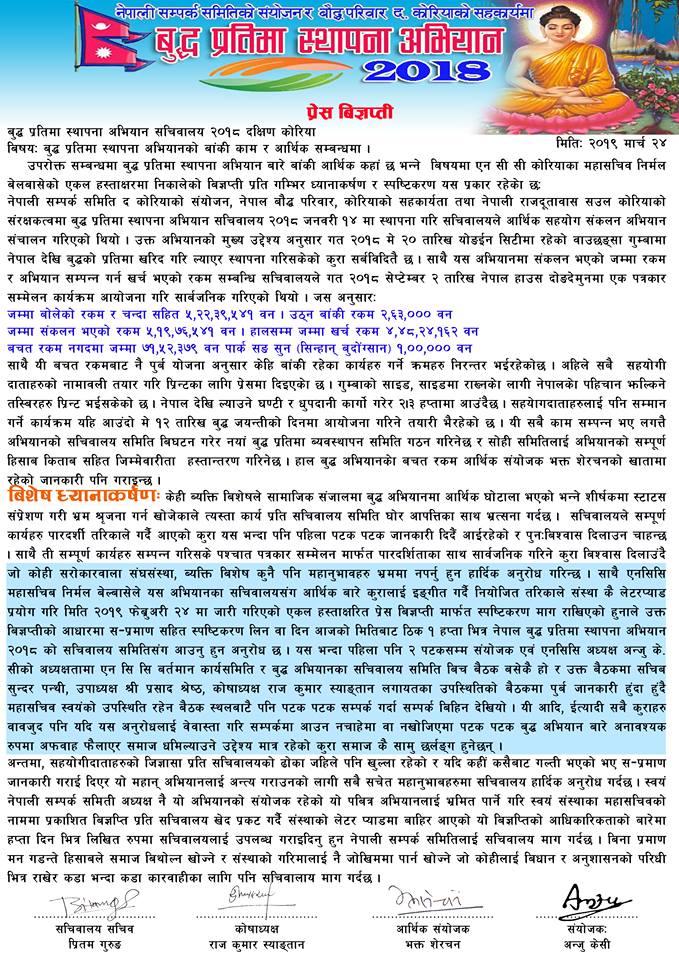 बिशेष ध्यानाकर्षण:- केहि ब्याक्ति बिशेषले सामाजिक संजालमा बुद्ध अभियानमा आर्थीक घोटला भएको भन्ने शिर्षकमा स्टाटस संप्रेशण गरि भ्रम श्रृजना गर्न खोजेकाले त्यस्ता कार्य प्रति सचिबालय समिति घोर अापत्तिका साथ भ्रत्सना गर्दछ । सचिबालयले सम्पुर्ण कार्यहरू पारदर्शी तरिकाले गर्दै आएको कुरा यस भन्दा पनि पहिला पटक पटक जानकारी दिदैं आईरहेको र पुन:बिश्वास दिलाउन चाहान्छ। ती सम्पूर्ण कार्यहरु सम्पन्न गरिसके पश्चात पत्रकार सम्मेलन मार्फत पार्दर्शिताका साथ सार्वजनिक गरिने कुरा बिश्वास दिलाउदै जो कोही सरोकारवाला संघ संस्था, ब्याक्ति बिशेष कुनै पनि महानुभावहरू भ्रममा नपर्नु हुन हार्दिक अनुरोध गरिन्छ। साथै एन सि सि महासचिब निर्मल बेल्बासेले यस अभियानका सचिबालय संग आर्थिक बारे कुरालाई ईङ्गीत गर्दै नियतबस मिति २०१९ फेब्रुरि २४ मा जारी गरिएको एकल हस्ताक्षरित प्रेस बिज्ञप्ती मार्फत स्पष्टिकरण माग राखिएको हुनाले उक्त बिज्ञप्तीको आधारमा स-प्रमाण सहित स्पष्टिकरण लिन वा दिन आजको मितिबाट ठिक १ हप्ता भित्र नेपाल बुद्ध प्रतिमा स्थापना अभियान २०१८ को सचिवालय समिति संग सम्पर्कमा आउनु हुन अनुरोध छ।