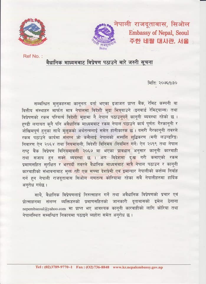 वैधानिक विप्रेषणलाई निरुत्साहन गर्न अवैधानिक विप्रेषणको प्रचार एंव प्रोत्साहनमा संलग्न व्यक्तिहरुको प्रमाण सहितको जानकारी दुतावासको इमेल nepambseoul@yahoo।com मा दिन सक्नुहुनेछ भने यदि नियम विपरित कार्य गरेको प्रमाणित भएमा कानुनी कार्वाहीको लागि कोरिया तथा नेपाल स्थित सम्वन्धित निकायमा पठाइने समेतको जानकारी दिएको छ ।