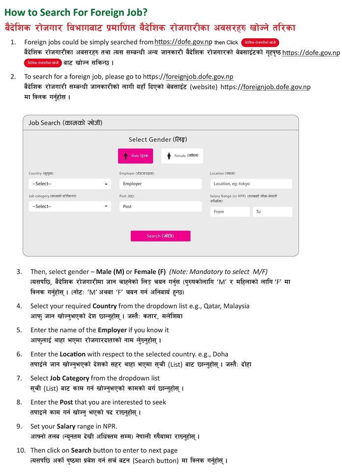 बैदेशिक रोजगारमा जान चाहनेले आफ्नो काम अनलाइनबाटै छान्न सक्ने ब्यवस्था मिलाइएको छ।कामको प्रकृती, पारिश्रमिक, श्रमिक पठाउने जिम्मा पाएको कम्पनी सबैका बारेमा सिधै  https://foreignjob.dofe.gov.np  मा हेर्न सकिने विभागका महानिर्देशक भिष्मकुमार भुषलले जानकारी दिए।