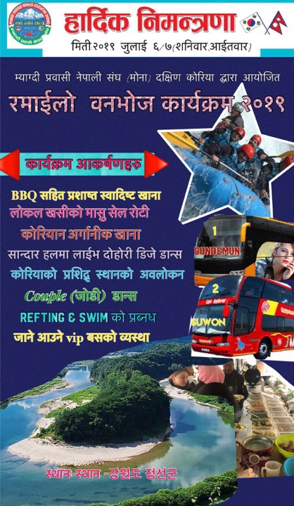 दक्षिण कोरियास्थित म्याग्दीलीहरुको गौरवमय इतिहास बोकेको सामाजिक संस्था मोना दक्षिण कोरियाको आयोजनामा रमाइलो वनभोज कार्यक्रम हुने भएको छ । आउँदो महिना जुलाई ६ र ७ गते गरि दुई दिन सम्म गरिने उक्त वनभोज कार्यक्रमा कोरियामा रहनुहुने सम्पुर्ण म्याग्दीलीहरु उपस्थिति रहने आयोजक मोना दक्षिण कोरियाले जनाएको छ ।