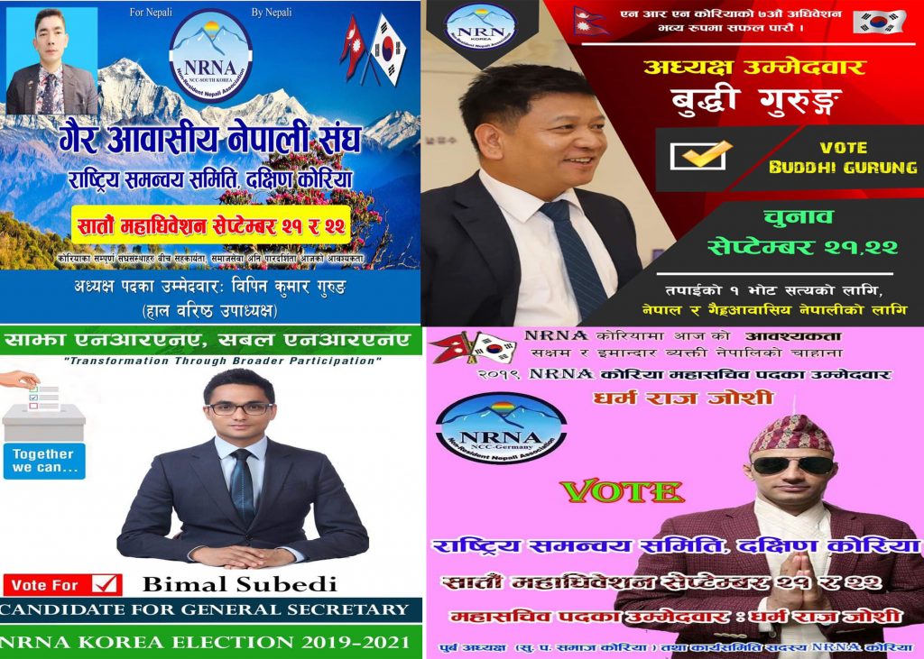गैरआवासीय नेपाली संघ (एनआरएन) दक्षिण कोरियामा यतिबेला चुनावको मेला चलिरहेको छ । प्रत्यक दुई दुई बर्षमा आउने यो मेलामा हजारौं नेपालीहरुले सहभागिता जनाउने गर्छन प्रत्यक्ष होस् वा अप्रत्यक्ष ।दुई महिना अगाडी देखि नै प्रत्यक्ष रुपमा मेलामा होमिने रुपमा बिशेष गरेर उम्मेदवार पर्ने गर्छन ।कोरियाली भूमिमा रहेर नेपाल र नेपालीको हितका लागी भनेर उम्मेदवारी दिने उम्मेदवारहरुका नाराहरु पढेर गिज्याउने नेपालीहरुको हरुको जमात पनि ठुलै छ कोरियामा । तर जो जसलाई चुनाव लाग्छ उनीहरु भने खुलेरै लागी पर्छन ।