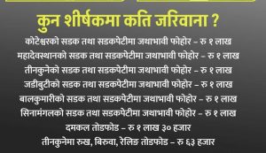 काठमाडौं : काठमाडौं महानगरपालिकाले पूर्वराजा ज्ञानेन्द्र शाहलाई विभिन्न शीर्षकमा जरिवाना गरेको छ। काठमाडौं महानगरपालिकाले शुक्रबार तीनकुने क्षेत्रमा पुर्याएको क्षति विविरणसहित विभिन्न शीर्षकमा जरिवाना तोकेर निर्मल निवासलाई पत्र काटेको हो।